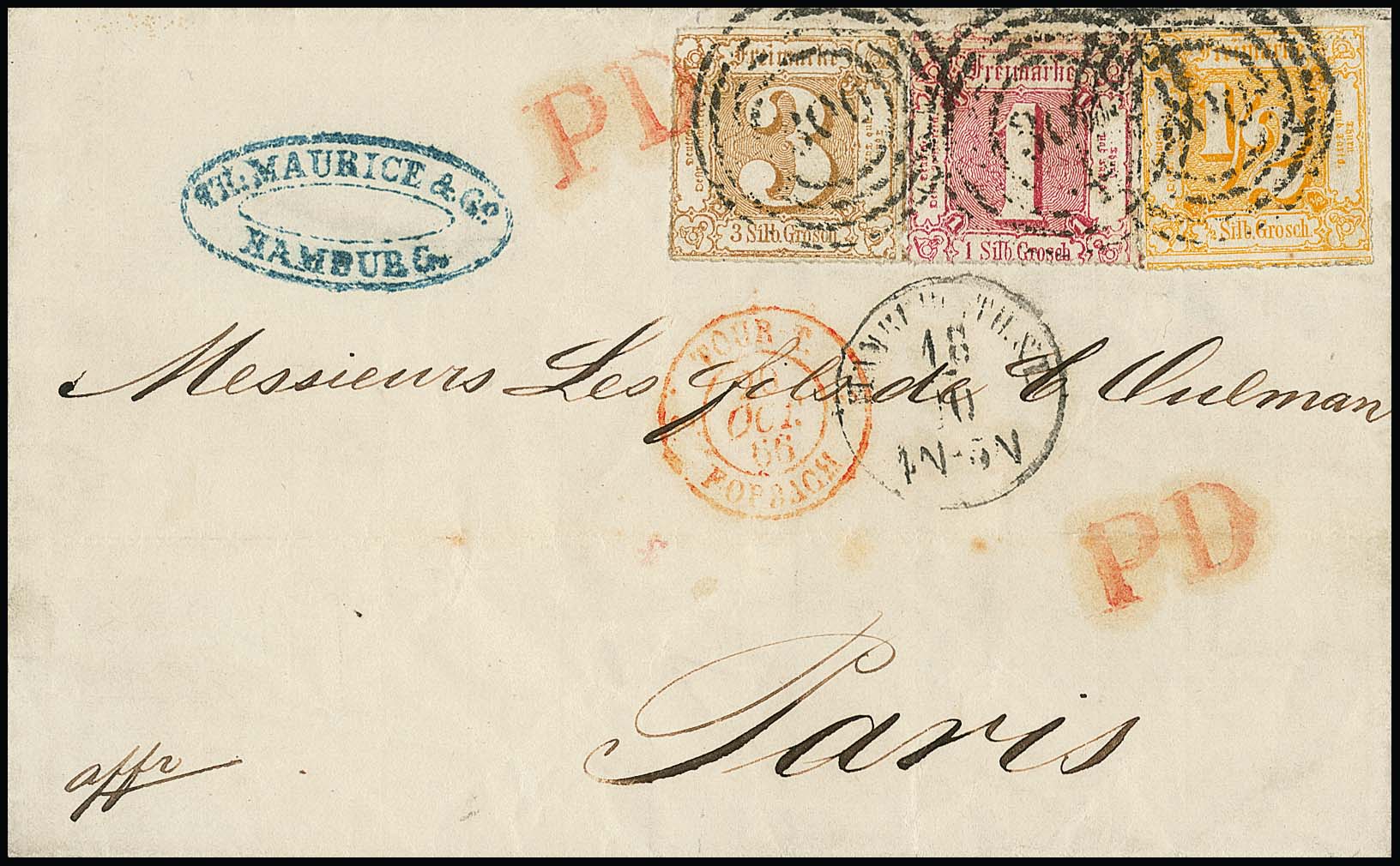 1/2 Sgr. orange, 1 Sgr. rot und 3 Sgr. ockerbraun auf Prachtbrief von Hamburg 1866 nach Paris