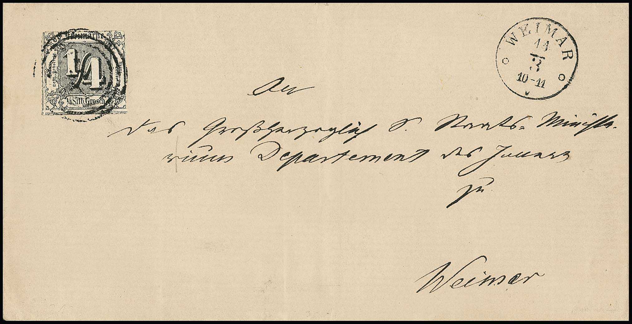 1/4 Sgr. schwarz, Prachtstück mit NS "251" und K1 "Weimar" auf Ortsbrief, seltene Frankatur, sign. Brettl, Haferkamp. Mi. 2800,- +