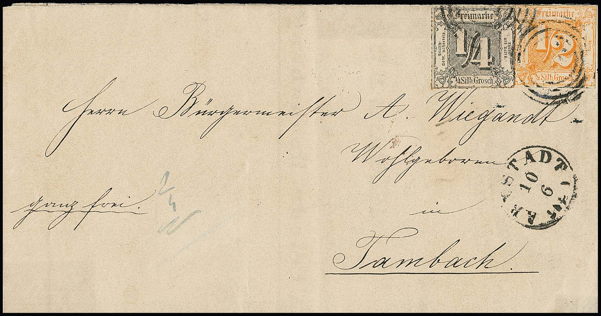 1/4 Sgr. schwarz nebst 1/2 Sgr. orange auf Brief (Gebrauchserhaltung, u.a. innen mit Klebestreifen gestützt, Marken kl. Knitter) von Arnstadt nach Tambach, Mi. 1300,-