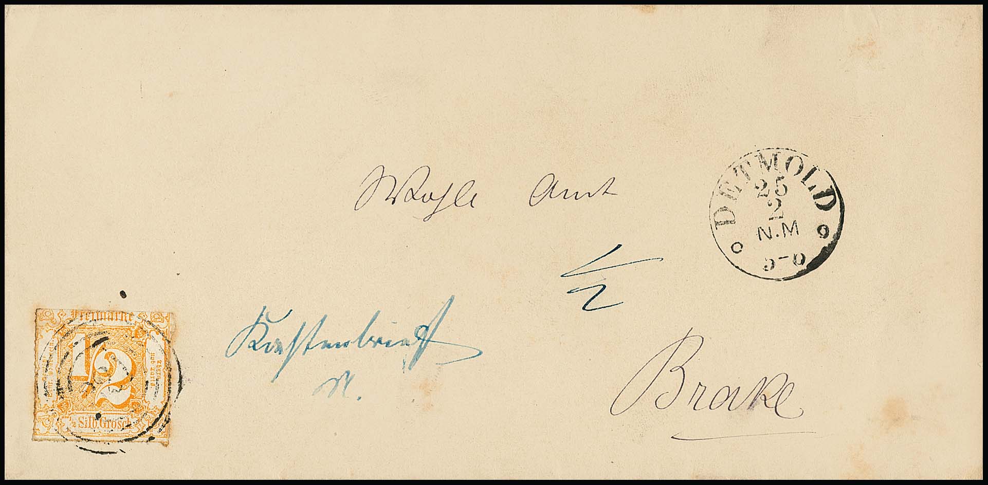 1/2 Sgr. orange als Einzelfrankatur mit NS "321" und K1 "Detmold" auf Brief nach Brake im Landbezirk von Lemgo, etwas fleckig, neben der Marke blauer hs. Postvermerk "Kastenbrief" und Taxe "1/2"