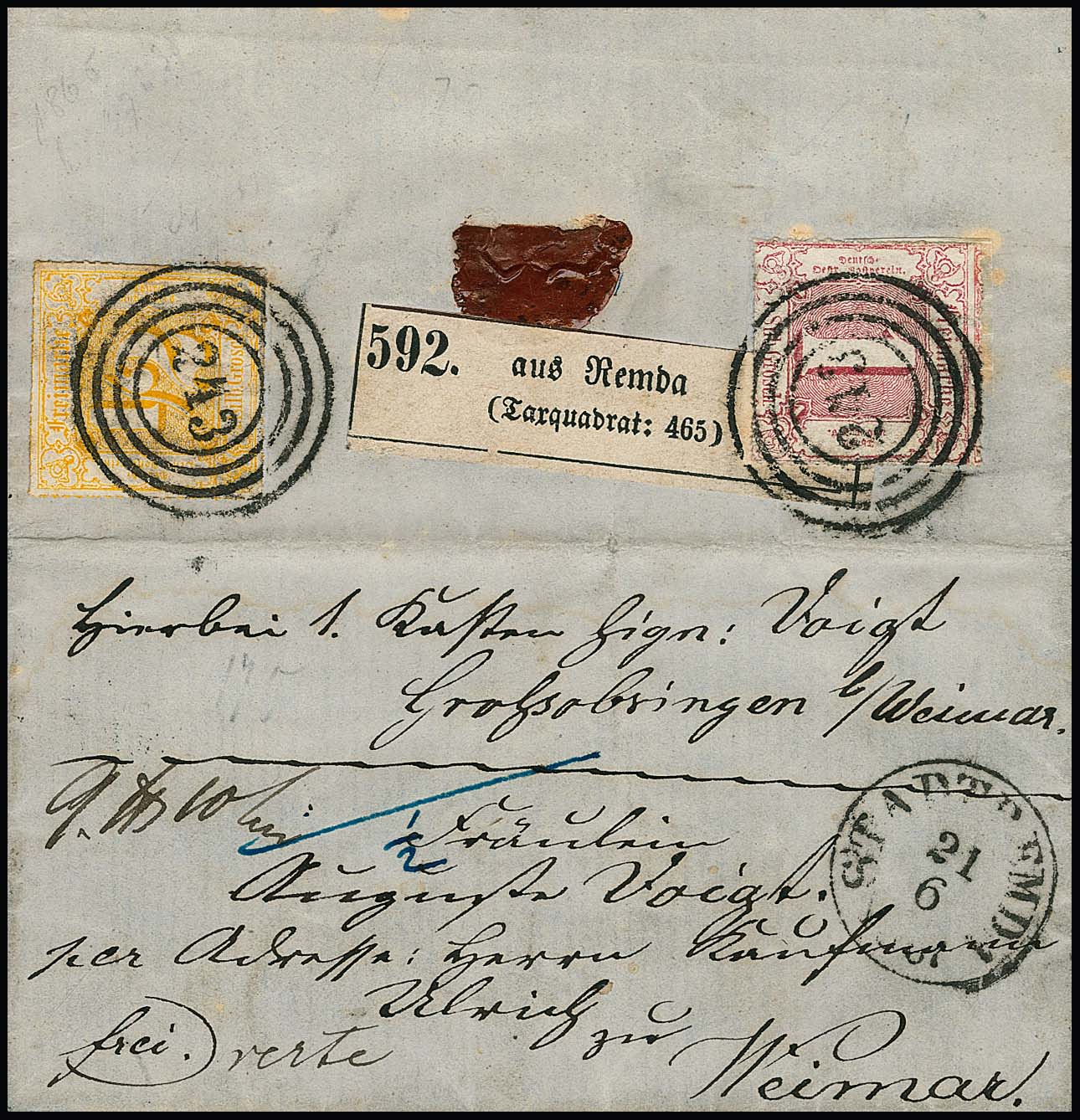 1 Sgr. rot (min. randfleckig) in Mischfrankatur mit 1/2 Sgr. rosa gelborange rs. auf Paketbegleitbrief nach Weimar, NS "243" und K1 "Stadtremda" nebst entspr. Paketaufkleber. Seltenes und attraktives Ganzstück im kleinen Format aus der nur kurze Zeit möglichen Periode der frankierten Fahrpostsendungen