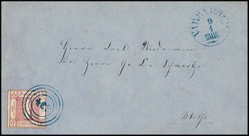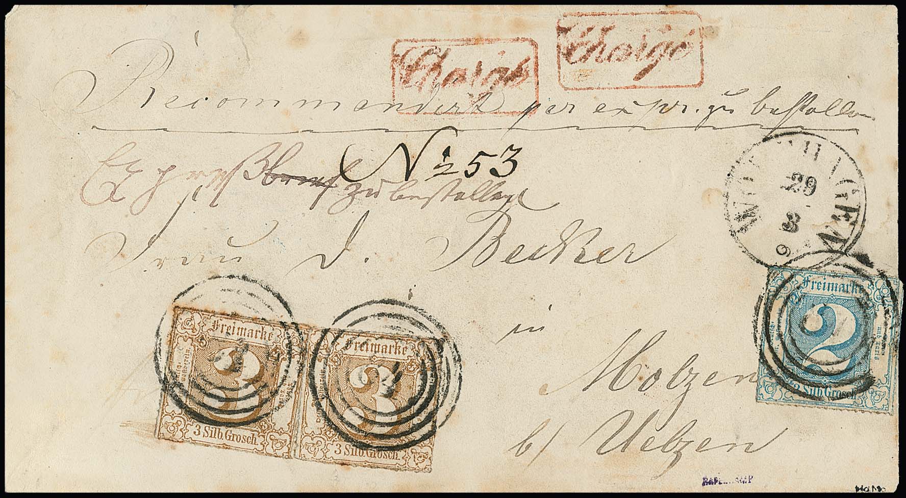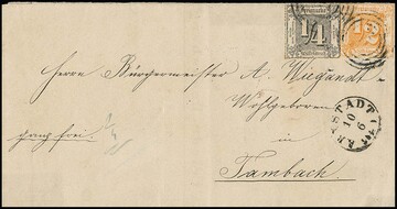 2 Sgr. blau und zweimal 3 Sgr. ockerbraun auf leider etwas fleckigem Land-Expreßcouvert mit NS "84" und K1 "Wolfhagen" nach Holzen im Landbezirk von Uelzen, wobei vom Empfänger weitere 10 Gr. Landexpreß-Zustellgebühr erhoben wurde (rs. quittiert). Taxis-Landexpreßbriefe in den Postverein sind nur in wenigen Exemplaren bekannt! Sign. Haferkamp