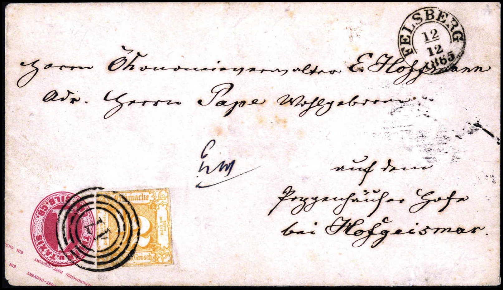 1/2 Sgr. orange (links Schere) auf Ganzsache 1 Sgr. rosa, als kopfstehend beschrifteter Umschlag nach Hofgeismar, NS "17" und K2 "Felsberg"
