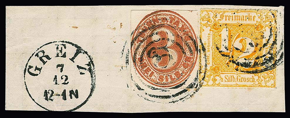 1/2 Sgr. orange nebst viereckigem Ganzsachen-Ausschnitt 3 Sgr. braun auf Prachtbriefstück mit NS "292" und K1 "Greiz"