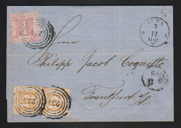 1/2 Sgr. orange, zwei Kabinettstücke in Mischfrankatur mit 1 Sgr. rosa (unauffälliger Aufklebefehler) auf Faltbrief nach Frankfurt, NS "234" und K1 "Jena"
