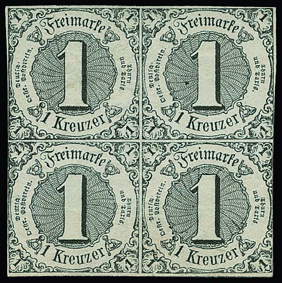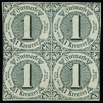 1 Kr. schw./graugrün, seltener ungebrauchter Viererblock mit Originalgummi, oberes Paar etwas dünn und rechte untere Marke kleiner Randspalt. Fotoexp. Sem "optisch ansprechende Einheit"
