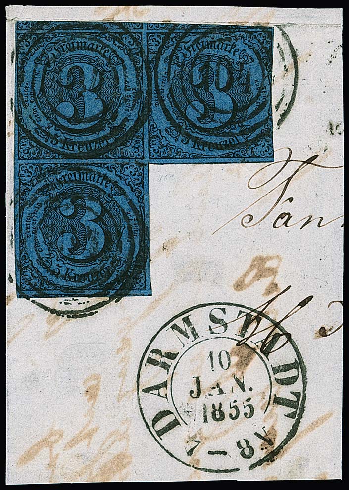 3 Kr. schw./blau, seltener Dreierblock, davon das linke Paar riesenrandig, auf Briefstück mit NS "104" und K2 "Darmstadt", sign. Helbig