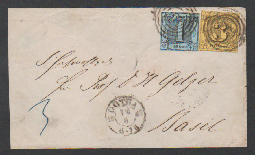 3 Sgr. schw./gelb, teils überrandig, und 1 Sgr. schw./graublau auf Prachtbrief (leichte Gebrauchsspuren wie Knitter) von Gotha 1860 nach Basel