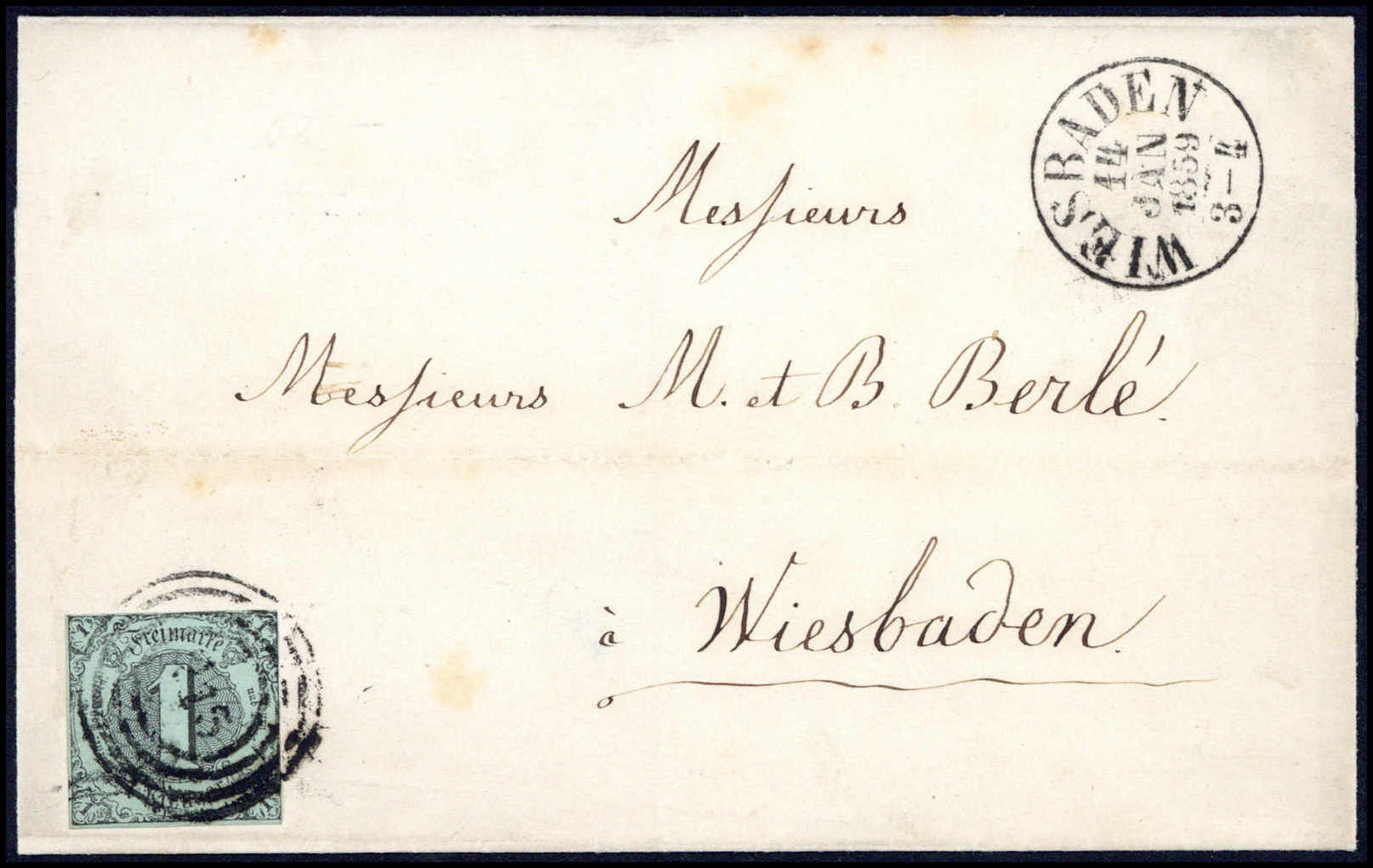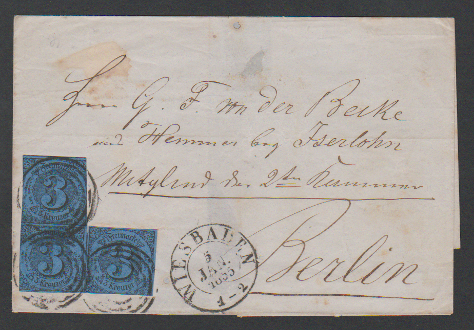 3 Kr. schw./blau, Paar und Einzelstück, üblicher Schnitt, auf leicht fleckigem Brief an einen Abgeordneten (von der Becke) von Wiesbaden 1855 nach Berlin