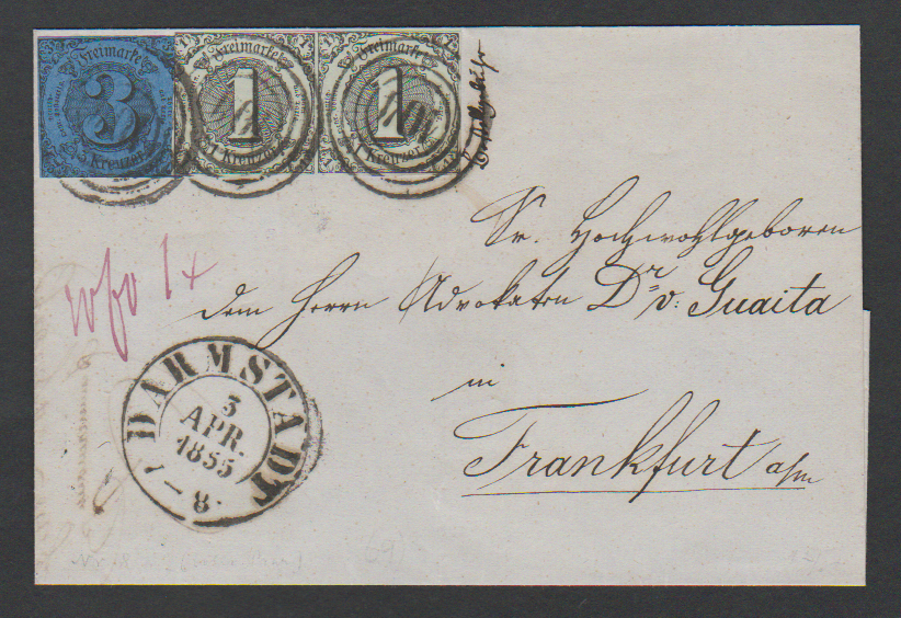 1 Kr. schw./graugrün, Prachtpaar, nebst 3 Kr. schw./blau, auf Bestellgeldbrief mit NS "104" und K2 "Darmstadt" 1855 nach Frankfurt