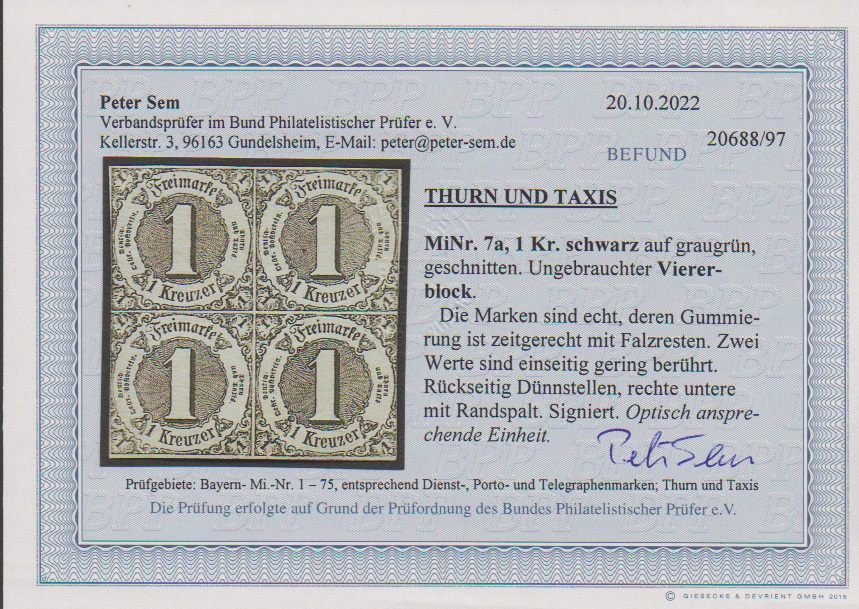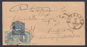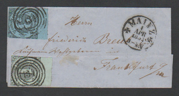 1 Kr. schw./bläulichgrün und 3 Kr. schw./graublau, beide (!) mit breitem oberem Bogenrand, teils üblicher Taxisschnitt, auf Bestellgeldbriefchen von Mainz nach Frankfurt