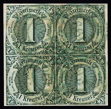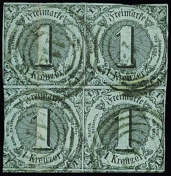 1 Kr. schw./bläulichgrün, von dieser Nuance seltener gestempelter Viererblock (linkes Paar Bug geglättet)