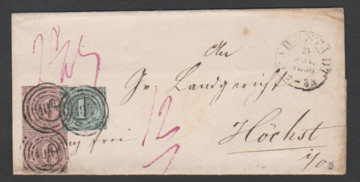 1 Kr. schw./blaugrün und Paar 6 Kr. schw./dunkelrosa, teils verschnitten, auf Bestellgeldbrief (kl. Randtönung) der 3. Gewichtsstufe von Darmstadt 1856 nach Höchst