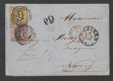 6 Kr. schw./rosa und 9 Kr. schw./gelb, üblicher Schnitt, auf Auslandsbrief 1860 von Mainz nach Nancy
