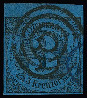 3 Kr. schw./dunkelblau, außergewöhnlich breit geschnittenes Luxus-Oberrandstück mit zentr. klarem Vierring-Versuchsstempel von Frankfurt/M. und Teil eines blauen Firmen-Absenderstempels