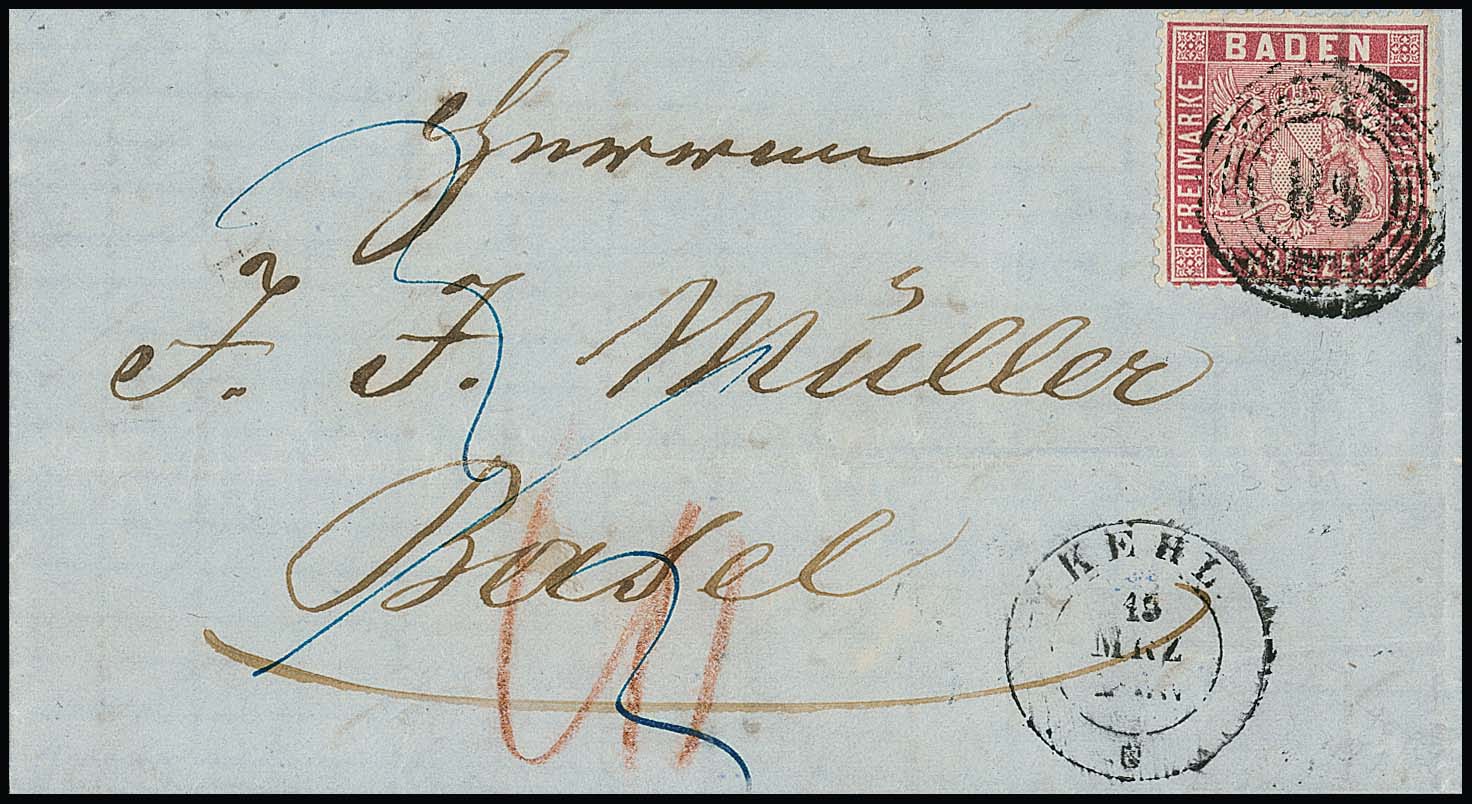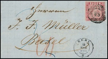 9 Kr. karmin einzeln auf nachtaxiertem Prachtbrief von Kehl 1863 nach Basel mit Taxe "3" (Kr.) bzw. "10" Rp., sign. Englert