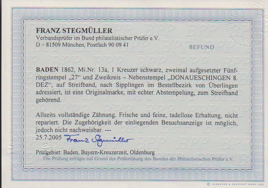 1 Kr. schwarz als tadellose Einzelfrankatur auf Drucksache (Schleife mit wahrscheinlich zugehörigem Inhalt) aus Donaueschingen, Fotoexp. Stegmüller