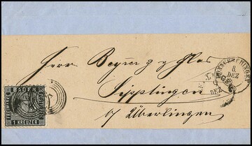 1 Kr. schwarz, zwei Briefe mit Paar-Frankaturen, aus Freiburg (Brief kl. Einriß, Paar gut) bzw. Lörrach (ein Wert kl. Zahnspalt)