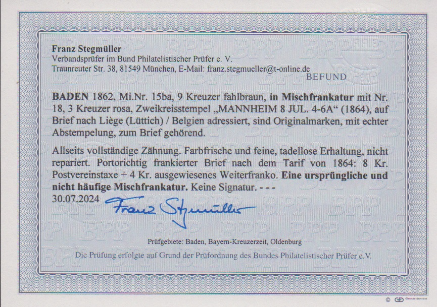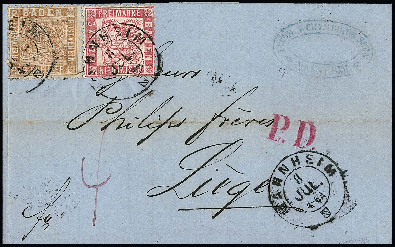 9 Kr. fahlbraun in Mischfrankatur mit 3 Kr. rosa, perfekte Exemplare als sehr seltene Kombination auf Brief (Mittelfalte ausserhalb) mit K2 "Mannheim" 1864 nach Liege/Belgien, Fotoexp. Stegmüller