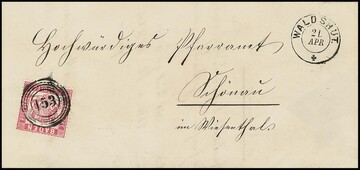 3 Kr. rosa, gut gezähntes Kabinettstück auf sauberem Brief (rs. nicht ganz komplett) mit NS "153" und K2 "Waldshut", Mi. 600,-