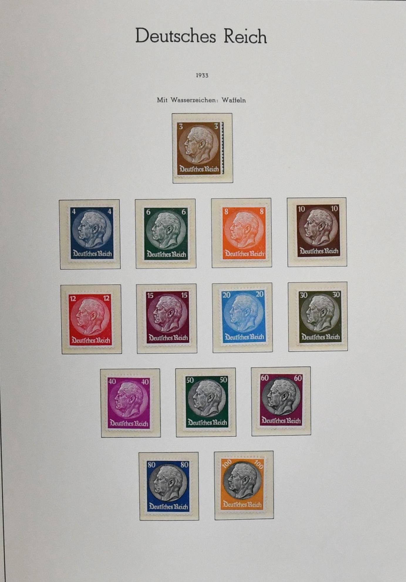 III. Reich, 1933-1945, komplette Sammlung inkl. Chicagofahrt gest. (Mi. 1000,-), Wagner in beiden Zähnungen gest. (Mi. 650,-), ungebr. Nothilfe-Block (Mi. 1500,-), Ostropa-Block mit SST (1100,-), Bl. 4/11, Stände-Satz, Nr. 695/99, 716/29 usw., bis Nr. 909/10, im älteren Vordruckalbum