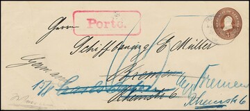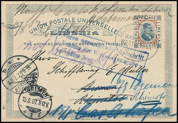 Liberia, 1907, Ganzsache 3 C. braun mit Ovalstempel "DSP Linie Hamburg-Westafrika" nach Bremen und dort weitergesandt
