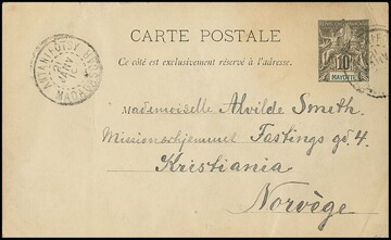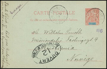 Mayotte, 1919, Ganzsachenkarte 10 C. (Gebrauchserhaltung) in Madagaskar (!) verwandt mit K2 "Antanifotsy" nach Christiania/Norwegen (seltene Postverbindung)