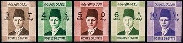 Ägypten, 1937, Freimarken 1 bis 10 Mills. Faruk in der seltenen geschnittenen Variante komplett, Auflage nur 50 Serien, ex König Faruk
