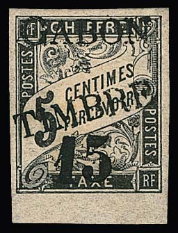 Gabun, 1889, "15" C. auf Portomarke 5 C. schwarz, Provisorium, ungebrauchtes Prachtstück vom Unterrand. Mi. 350,-