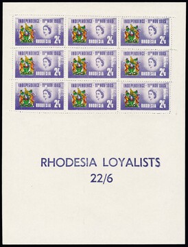 Rhodesien, 1965, 2 Sh. 6 P. Wappen, sehr seltene Propagandafälschung im kompletten postfrischen Bogen zu neun Exemplaren mit zusätzlicher Inschrift "Illegal" vor "Independence" und "Due" neben Postage, auf Feld 3 leichte Bugspur, vollständige Bögen der ohnehin seltenen Propagandafälschung gehören zu den Raritäten dieses Gebietes! Attest Pieles, Foto siehe Katalog-Rückseite