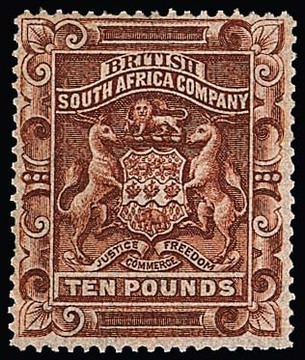 Britische Südafrika-Gesellschaft (Rhodesien), 1892, 10 Pfd. braun, der Höchstwert in seltener postfrischer Erhaltung, Mi. für Falz 4000,-, postfrisch mindestens 8000,-, sign. Diena und Attest Hansgeorg Richter