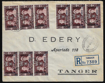 Marokko, Tanger 1937, 15 C. Krönungs-Aufdruckmarke per neun auf Orts-R-Brief aus Tanger