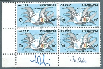 10 C. UNO im gestempelten Bogenecken-Viererblock mit Original-Unterschriften der Entwerfer M. und J. Dubois