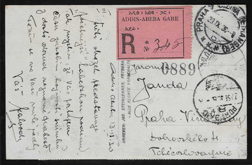 Haile Selassi, Aufdruckmarken 1/2 und 1 M. in Type I, 2 M. in Type II, bildseitig etwas randnah geklebt (dadurch gering bestoßen) auf Foto-R-Ansichtskarte von Addis-Abeba nach Prag