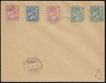 1/4 G. Menelik in gelblich und grün, versch. Auflagen, ebenso 1/2 G. in lachsrot und bräunlichlachsrot, sowie 1 Gr. blau, auf Blanko-Couvert aus Entotto 1908