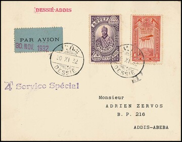 1 G. Flugpost und 1/2 G. Ras Makonnen auf Lupo-Brief Dessie-Addis, "4. Service Special", 30. Nov. 1932