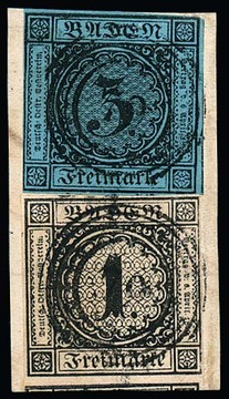 1 Kr. schwarz, breitrandiges gest. Kabinett-Paar, links auf voller Länge mit Teil der Nebenmarke, Fotoexp. Stegmüller "einwandfrei"