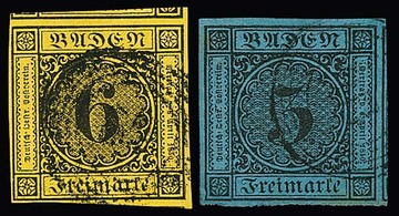 6 Kr. schw./blau- bzw. auf gelbgrün, je zwei Faltbriefe der 1. und 2. Auflage aus gleicher Korrespondenz nach Meersburg, zweimal Pracht, u.a. Briefe aus Kenzingen und Tryberg. Mi. 940,-