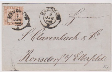 9 Kr. karmin, bis auf einen kurzen Zahn gut gezähnt, auf Faltbrief von Mannheim 1861 nach Aix/Frankreich, Mi. 600,-