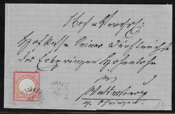 "Grünsfeld", nachverw. K2 zentrisch auf Kabinettbriefstück 1 Kr. kl. Brustschild, sowie auf Brief 3 Kr. (kl. Druckstelle vom Briefinhalt)
