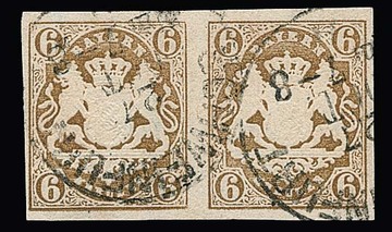 6 Kr. braun, breitrandiges Prachtpaar mit K1 "Augsburg Bahnhof", rechte Marke Seidenfaden oben unbedeutend gelockert, Mi. 380,-