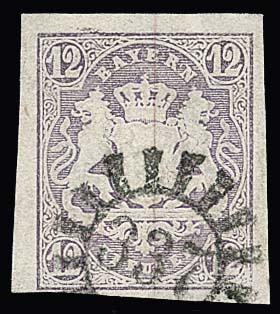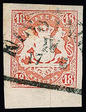 18 Kr. zinnoberrot, sehr breitrandig, unten bis zu 6mm Bogenrand, HK "Kissingen", sowie 1 Kr. dunkelgrün ungebraucht, kl. helle Stelle bzw. Bug, je Fotoexp. Stegmüller. Mi. 580,-