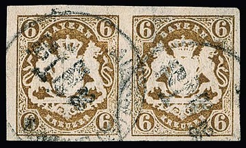 6 Kr. ockerbraun, Prachtpaar mit zartem blauem HK "Gessertshausen", Mi. 380,-