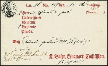 1810, seltener roter Einquartierungsschein aus Sauerlach als Aufbrauchs-Provisorium: Der Schein wurde schon 1809 während des Tiroler Aufstands gedruckt, aber erst nach dessen Ende verwendet, wobei die Jahreszahl handschriftlich in 1810 ausgesbessert wurde. Die verwendete rote Druckfarbe ist recht ungewöhnlich