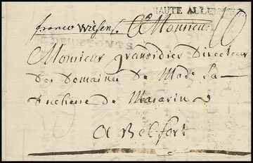 "Zweibrücken", 1769, erster L1 "DE DEUX PONTS" (Feuser 500,-) nebst besserem Transit-L1 "HAUTE ALLEMAGNE" auf Auslandsbrief "franco wresen" nach Belfort
