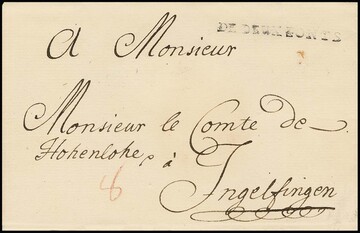 "Zweibrücken", (1743), klarer erster L1 "DE DEUX PONTS" auf Trauerbriefhülle nach Ingelfingen, Feuser 4082-1, 500,-