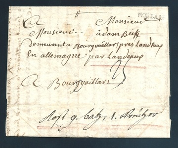Incoming-Mail, 1768, "Morlaix", L1 auf Kabinettbrief nach Burrweiler "par Landeaux" (über Landau), rs. "Kost 9 Batz, 1 Kreuzer (25 Sols)", innen "Vous chargerez Largent ala poste de Landeau"