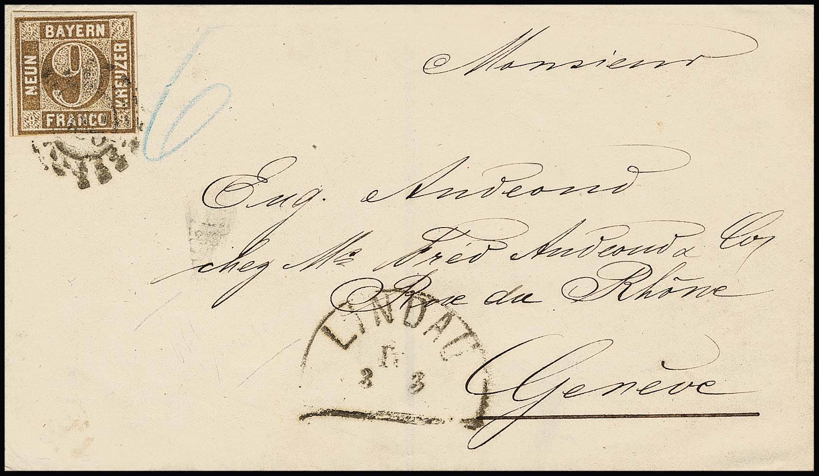 Zwei Briefe von Lindau je in die Schweiz, einmal mit perfekter 6 Kr. braun nach Glarus (1. Schweizer Rayon) mit "3X" ausgewiesenem Weiterfranko, der zweite mit etwas berührter 9 Kr. ockerbraun nach Genf und "6" Kr. Weiterfranko