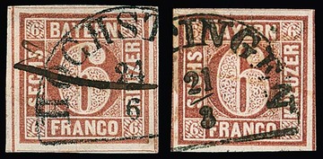 6 Kr. braun, Type I, zwei teils sehr breitrandige Kabinettstücke mit HK ("Höchstadt", "Dettingen") und Federzug, einmal sign. Pfenninger. Mi. 400,-