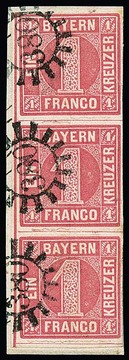 1 Kr. dunkelrosa, senkrechter Dreierstreifen auf Prachtbriefstück mit klaren gMR "380", typische kleine bayernbrüchige Stellen im Zwischenraum kein Mangel, Mi. 320,-